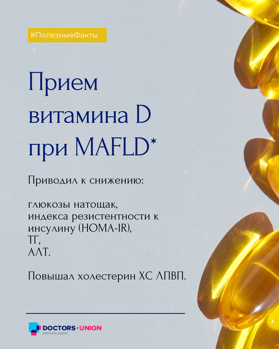 Прием добавок с витамином Д при MAFLD приводил к снижению уровня глюкозы натощак, триглицеридов, АЛТ, повышению уровня «полезного» холестерина ЛПВП.