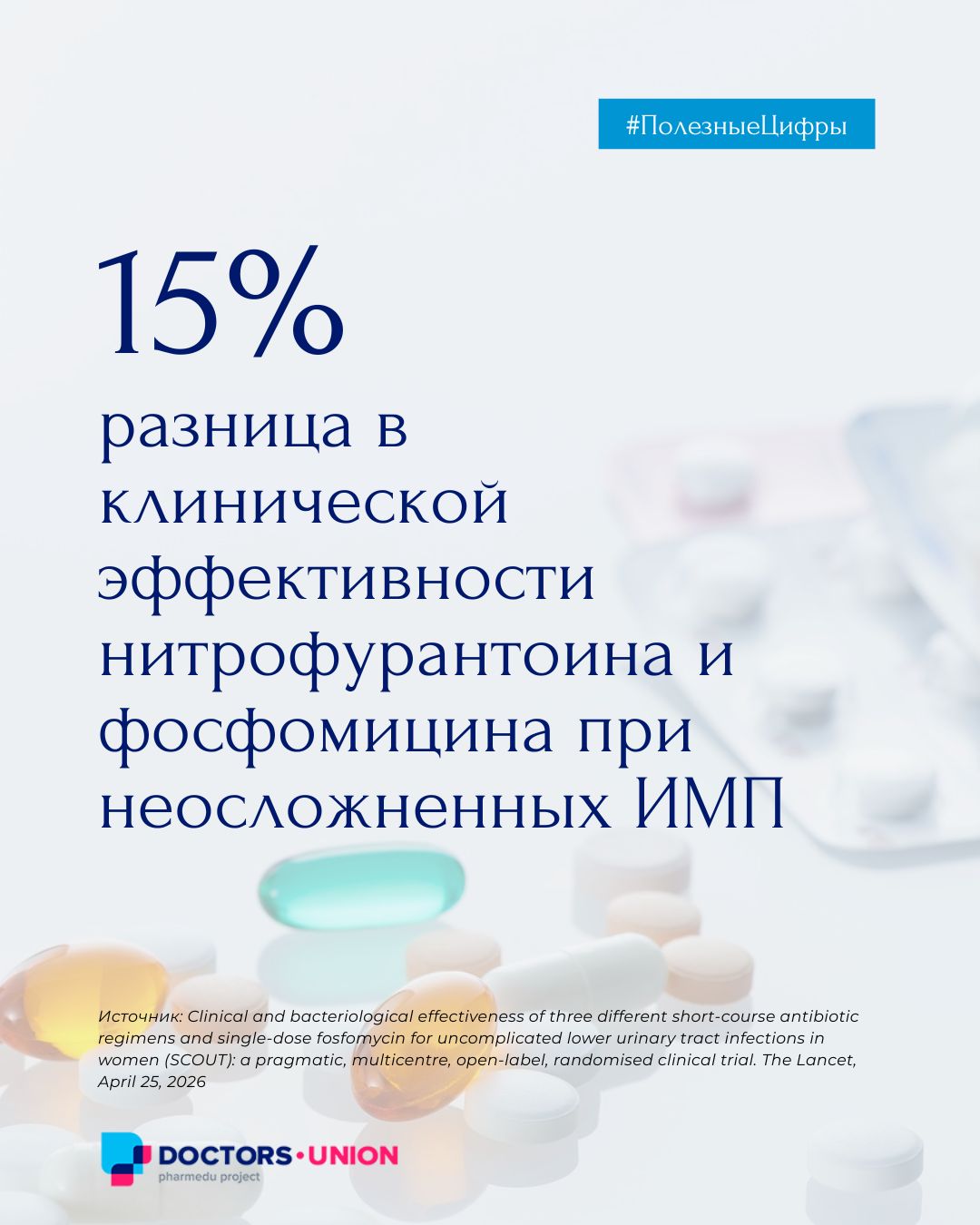 При неосложненных инфекциях мочевыводящих путей (ИМП) в исследовании SCOUT наибольшая клиническая эффективность выявлена у нитрофурантоина — 74%.