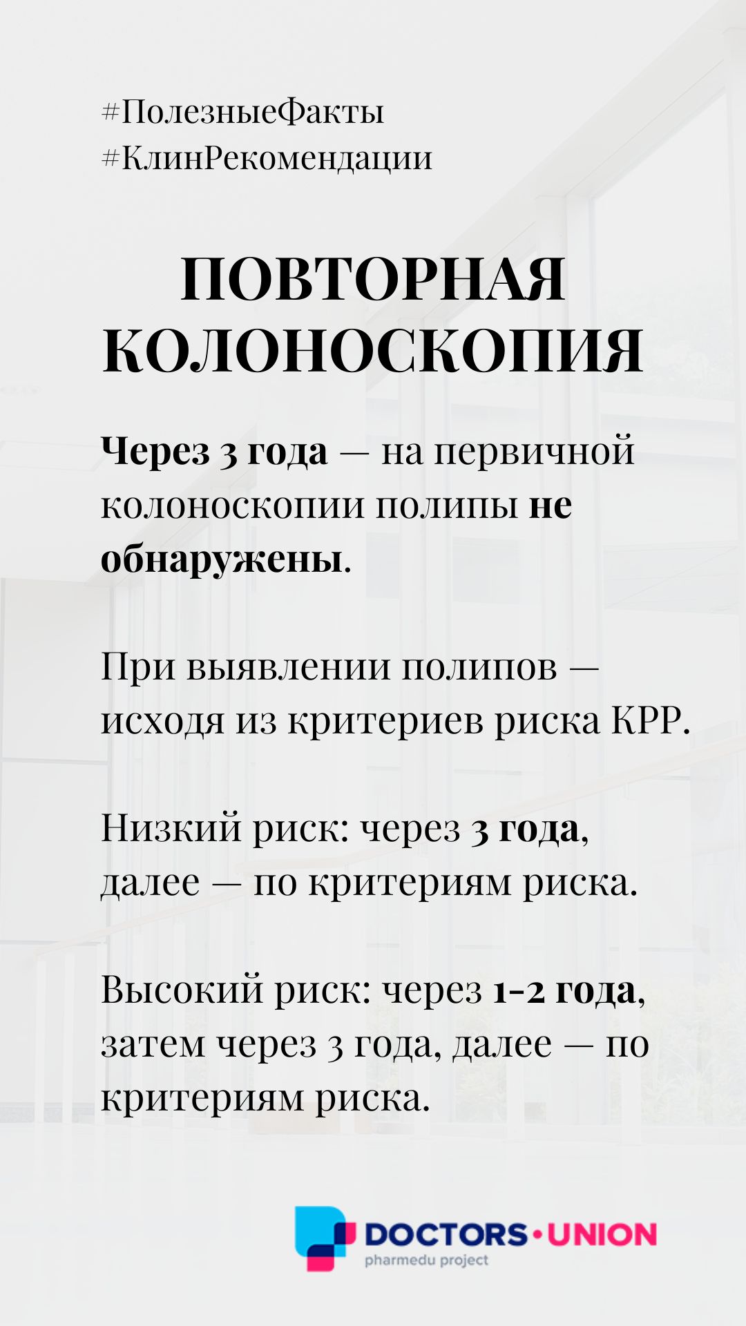 Сроки проведения первой и повторной колоноскопии изложены в новых клинических рекомендациях Минздрава «Полип толстой и прямой кишки», опубликованных 7 октября 2025 года.