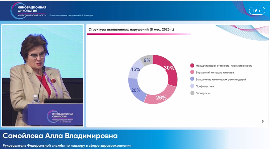 Руководитель Росздравнадзора Алла Самойлова на VI Международном Форуме «Инновационная онкология» сообщила о выявленных нарушениях в учреждениях онкологического профиля за первые восемь месяцев 2025 года, передает корреспондент «Союза Докторов».